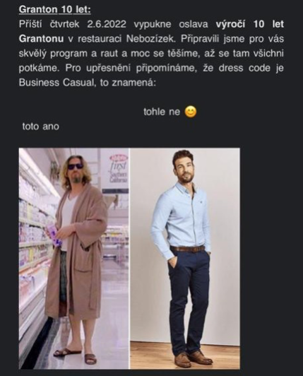 Když nadešel den D, hned několik z nás muselo povzpomínat, co to vlastně znamená business casual. Po několika dlouhých covidových letech jsme museli nechat tepláky doma a modlit se, že nám staré šaty, sukně či saka ještě stále padnou. Náš hvězdný HR tým ovšem nikdy nezklame, a proto poslal návod všem těm, co by si i tak nevěděli rady s garderobou. Chybičky se ovšem může dopustit každý, a tak jsme e-mailem v instrukcích obdrželi tento pokyn.