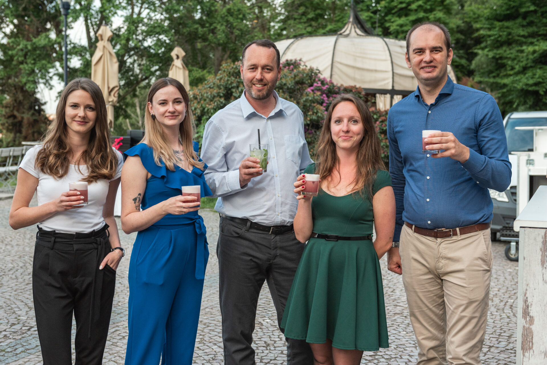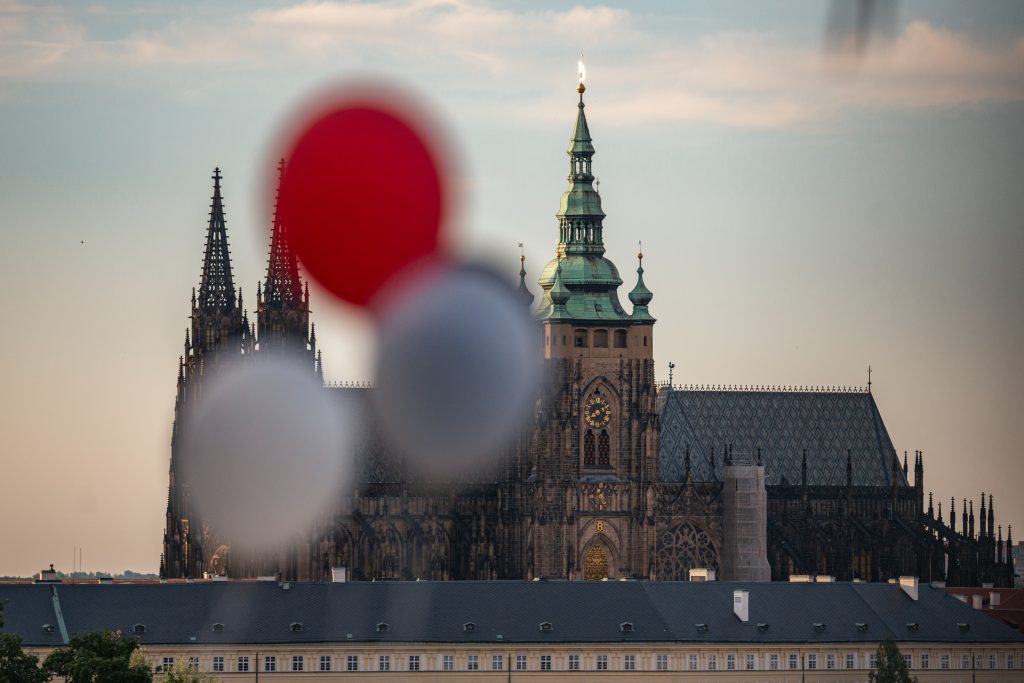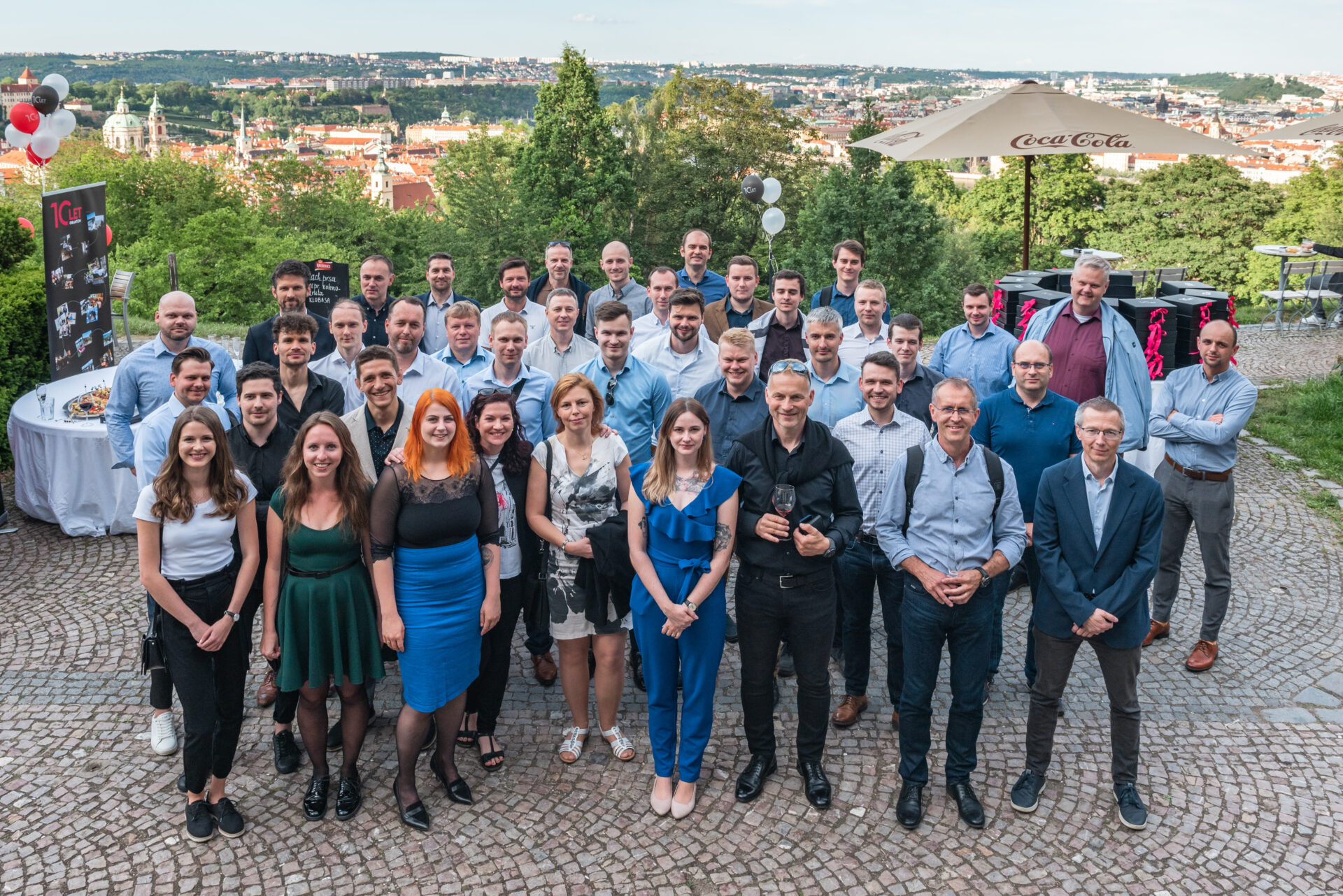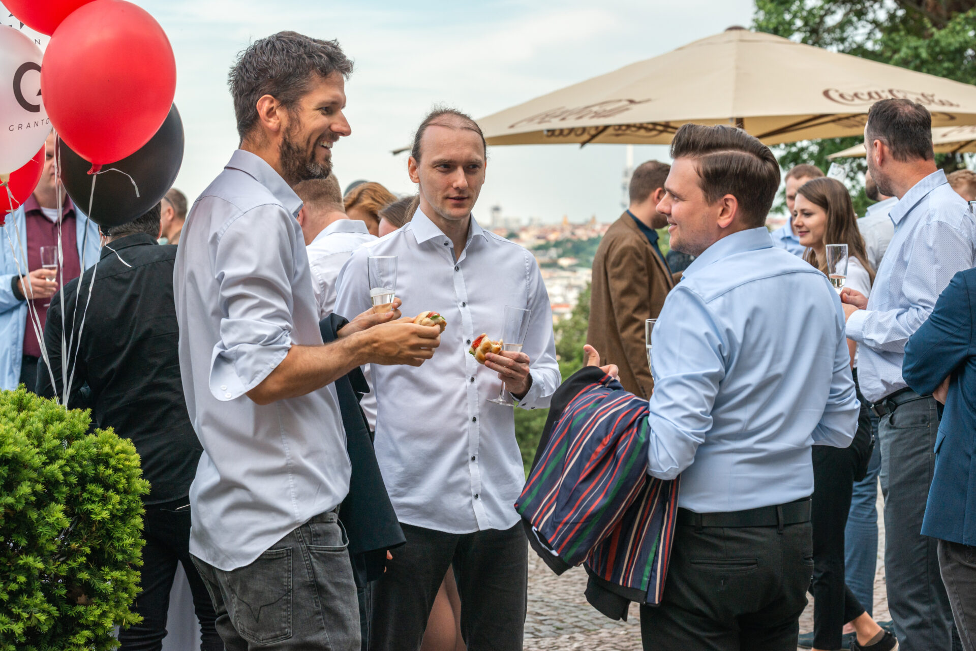 Někteří z nás zvolili výhodnější cestu na Nebozízek, a to směrem dolů. Po seběhnutí, což je v případě nás, které jsme na cestu po dlažebních kostkách – ne zcela vhodně – zvolily podpatky, lehký eufemismus, se nám otevřela úvodní scéna jako z kulis hollywoodské romantické komedie. Slunce, které se pomalu chystalo zapadnout, balónky v barvách firmy, věž z dárků a kolegové popíjející welcome drinky v dobře padnoucích oblecích.