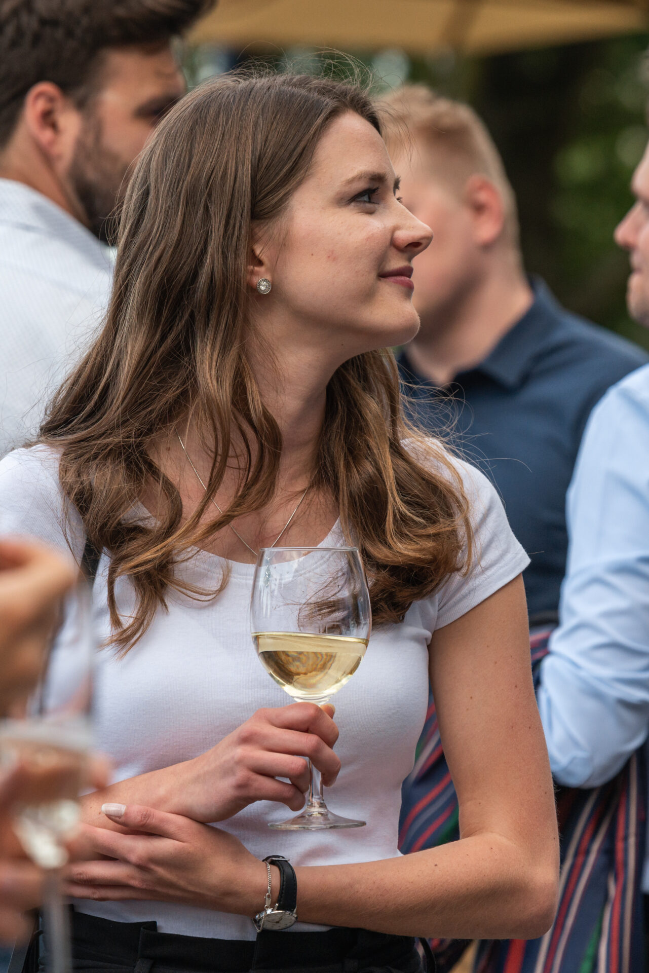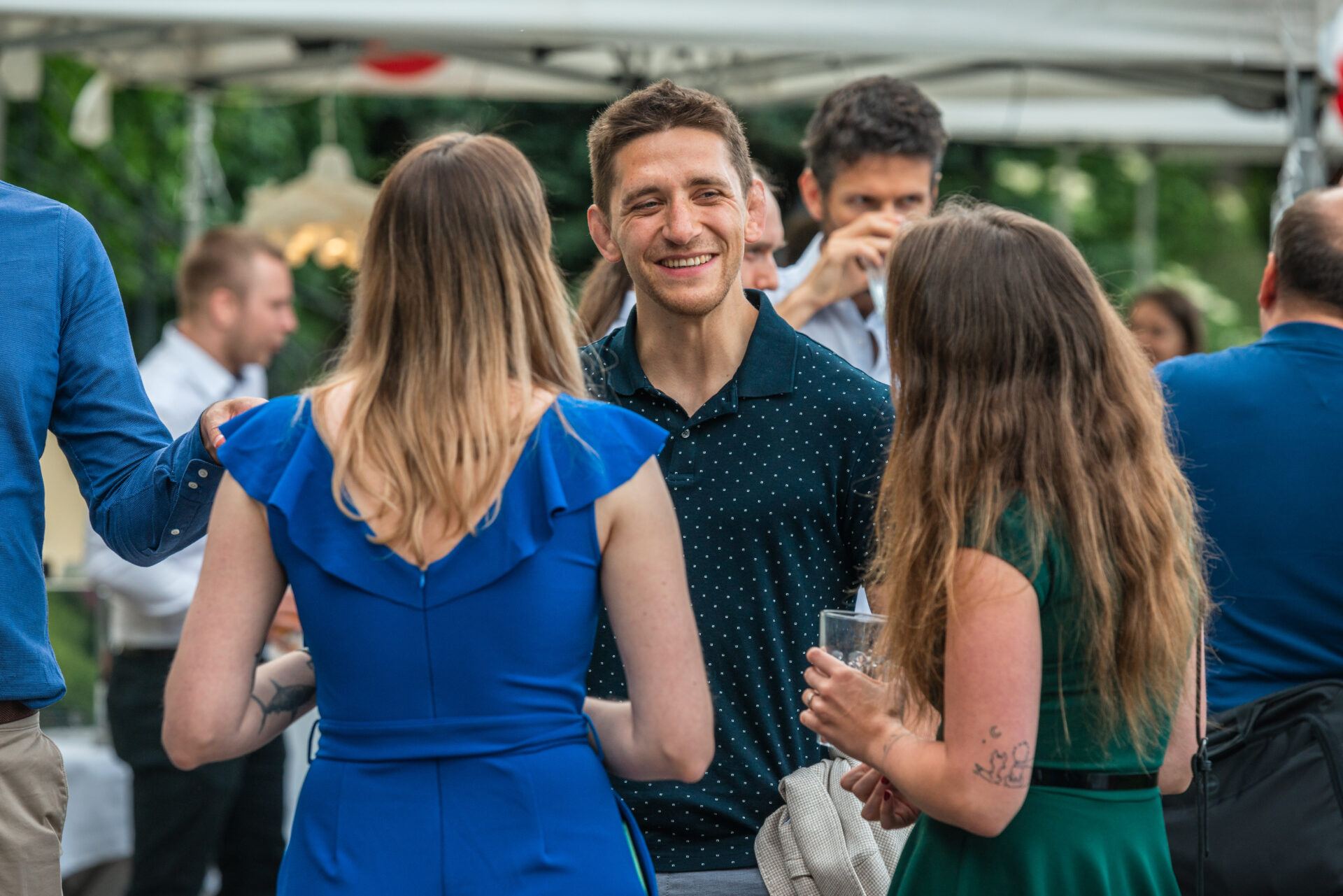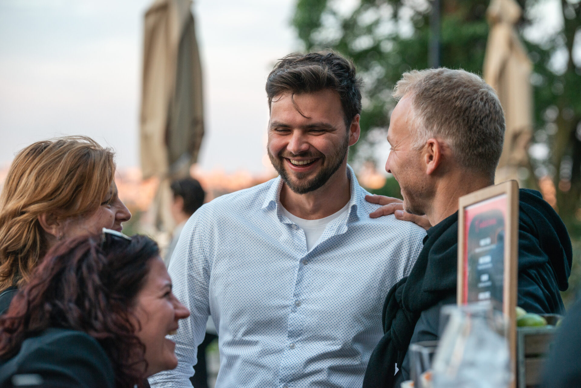 Někteří z nás zvolili výhodnější cestu na Nebozízek, a to směrem dolů. Po seběhnutí, což je v případě nás, které jsme na cestu po dlažebních kostkách – ne zcela vhodně – zvolily podpatky, lehký eufemismus, se nám otevřela úvodní scéna jako z kulis hollywoodské romantické komedie. Slunce, které se pomalu chystalo zapadnout, balónky v barvách firmy, věž z dárků a kolegové popíjející welcome drinky v dobře padnoucích oblecích.