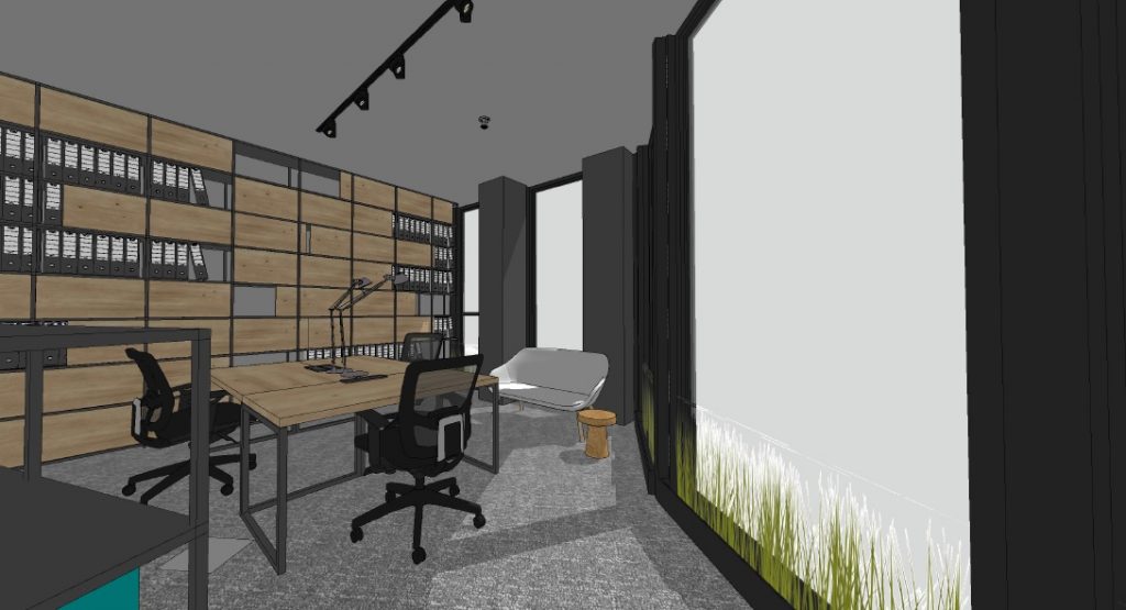 Po výběru místa přišlo na řadu vlastní zařizování kanceláře, na které jsme si najali architekta. Sdělili jsme mu všechny naše požadavky a on vytvořil konkrétní návrh. Ten jsme několikrát připomínkovali a naše kancelář dostala, aspoň na papíře, finální podobu.