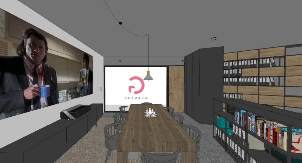 - část by měl tvořit odpočinkový koutek a neformální místo pro interní i externí schůzky. K dispozici bude větší stůl, ke kterému se vejde až 10 lidí, promítací plátno, repráky, ale i několik hi-tech vychytávek, které si zatím necháme pro sebe. V této části bude zároveň i menší gauč pro větší pohodlí při sledování filmů či hraní na PlayStationu, protože i to k budování našeho týmu patří.